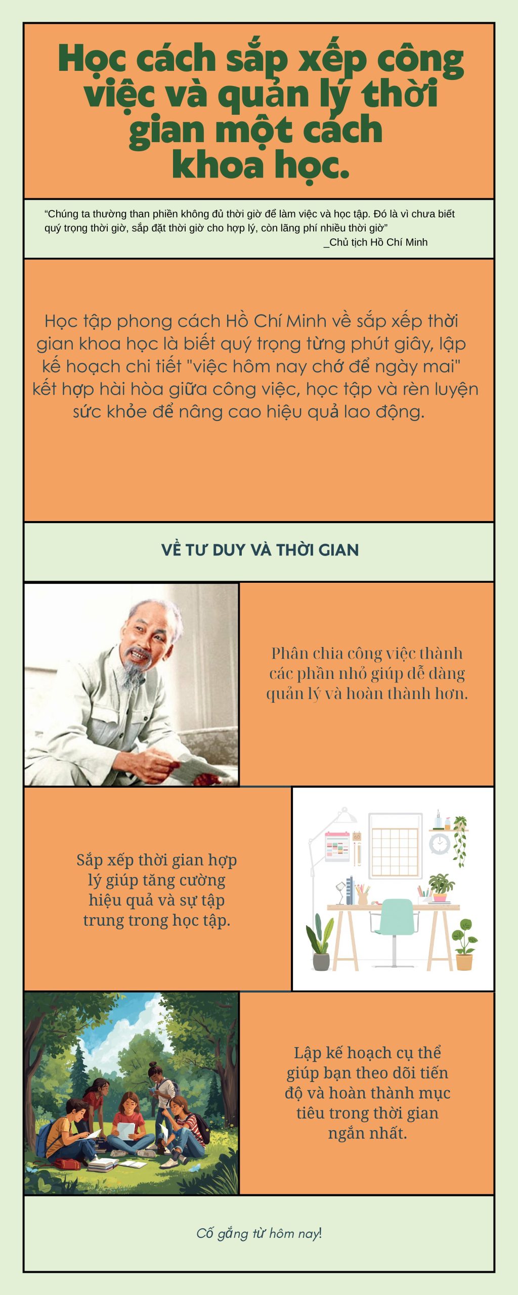 Từ tấm gương của Bác, tôi rút ra nhiều bài học thiết thực cho công tác giảng dạy và giáo dục học sinh. Trong dạy học Toán, việc rèn luyện cho học sinh tư duy khoa học thông qua cách giải bài có trình tự, lập luận chặt chẽ và quản lí thời gian làm bài hợp lí là vô cùng quan trọng. Bên cạnh đó, tôi luôn nhắc nhở học sinh xây dựng thời gian biểu học tập khoa học, biết phân chia thời gian hợp lí cho từng môn học, tránh học dồn, học vội gây áp lực và kém hiệu quả.