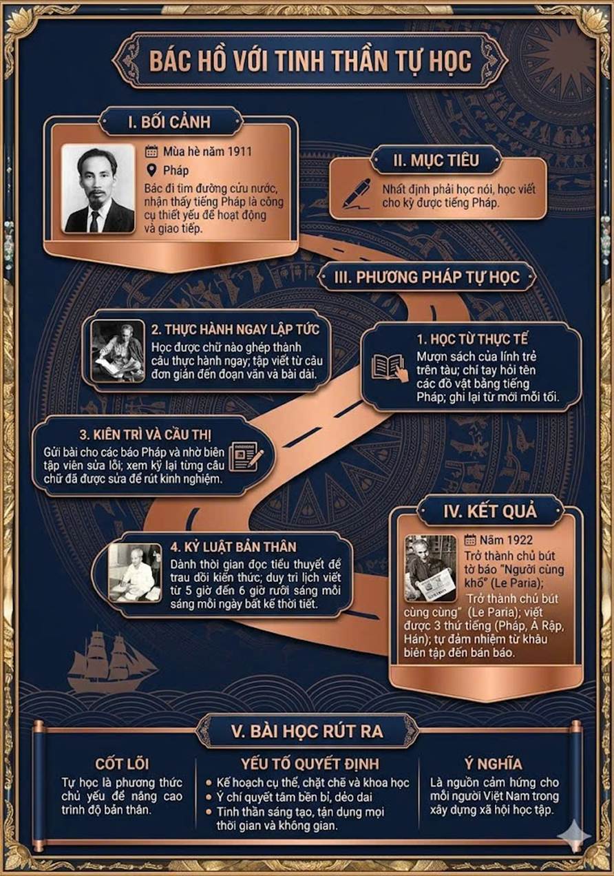 Hồ Chí Minh là lãnh tụ vĩ đại của dân tộc Việt Nam, người đã hiến dâng trọn đời mình cho sự nghiệp giải phóng dân tộc và hạnh phúc của nhân dân. Hành trình tìm đường cứu nước của Bác không chỉ là một cuộc hành trình lịch sử, mà còn là hành trình của trí tuệ, bản lĩnh và tinh thần tự học bền bỉ, trong đó nổi bật là nỗ lực phi thường trong việc tự học ngoại ngữ – một minh chứng sinh động cho tầm nhìn vượt thời đại.