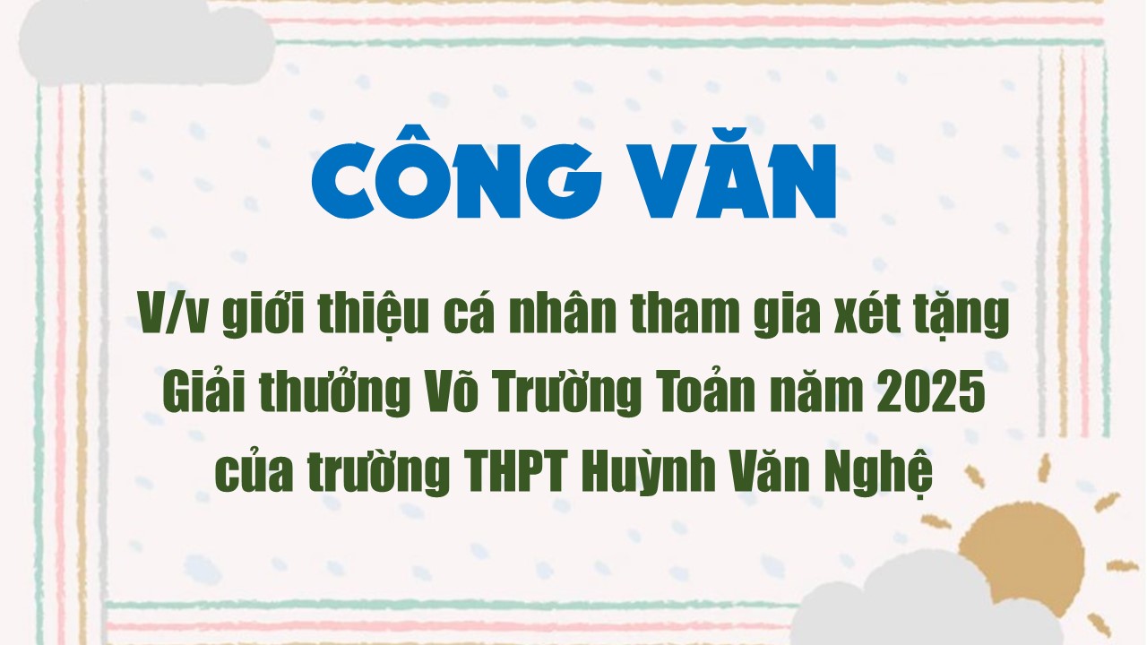 THÔNG BÁO-VĂN BẢN, THÔNG TIN CHUNG, TIN MỚI, TIN NỘI BỘ Công văn v/v giới thiệu cá nhân tham gia xét tặng Giải thưởng Võ Trường Toản năm 2025 của trường THPT Huỳnh Văn Nghệ 2 Tháng 10, 2025 - Trường THPT Huỳnh Văn Nghệ - 510 lượt xem Tải công văn tại đây: THPTHVN – CÔNG VĂN VỀ VIỆC GIỚI THIỆU CÁ NHÂN THAM GIA XÉT TẶNG GIẢI THƯỞNG VÕ TRƯỜNG TOẢN NĂM 2025 (1) Bài viết liên quan:Kế hoạch thực hiện xây dựng môi trường học đường…Thông báo về việc nghỉ lễ Giỗ Tổ Hùng VươngCÔNG ĐOÀN TRƯỜNG THPT HUỲNH VĂN NGHỆ THAM GIA HỘI…TRƯỜNG THPT HUỲNH VĂN NGHỆ THAM GIA HỘI THAO GIÁO…QUYẾT ĐỊNH Về việc công khai dự toán thu - chi ngân…THÔNG BÁO: Tổ chức kiểm tra, đánh giá chuyển đổi tổ…