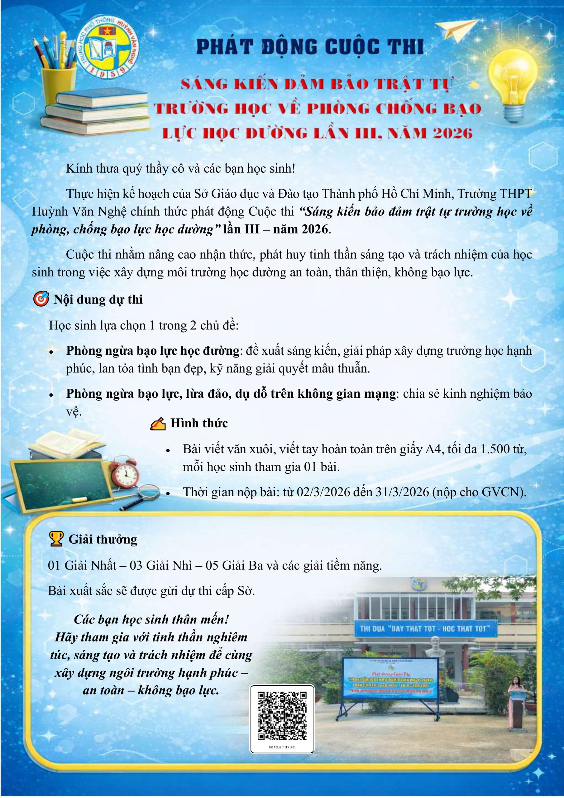 Thông tin chi tiết cuộc thi “Sáng kiến bảo đảm trật tự trường học về phòng, chống bạo lực học đường” lần III – năm 2026 vui lòng xem hình bên dưới.