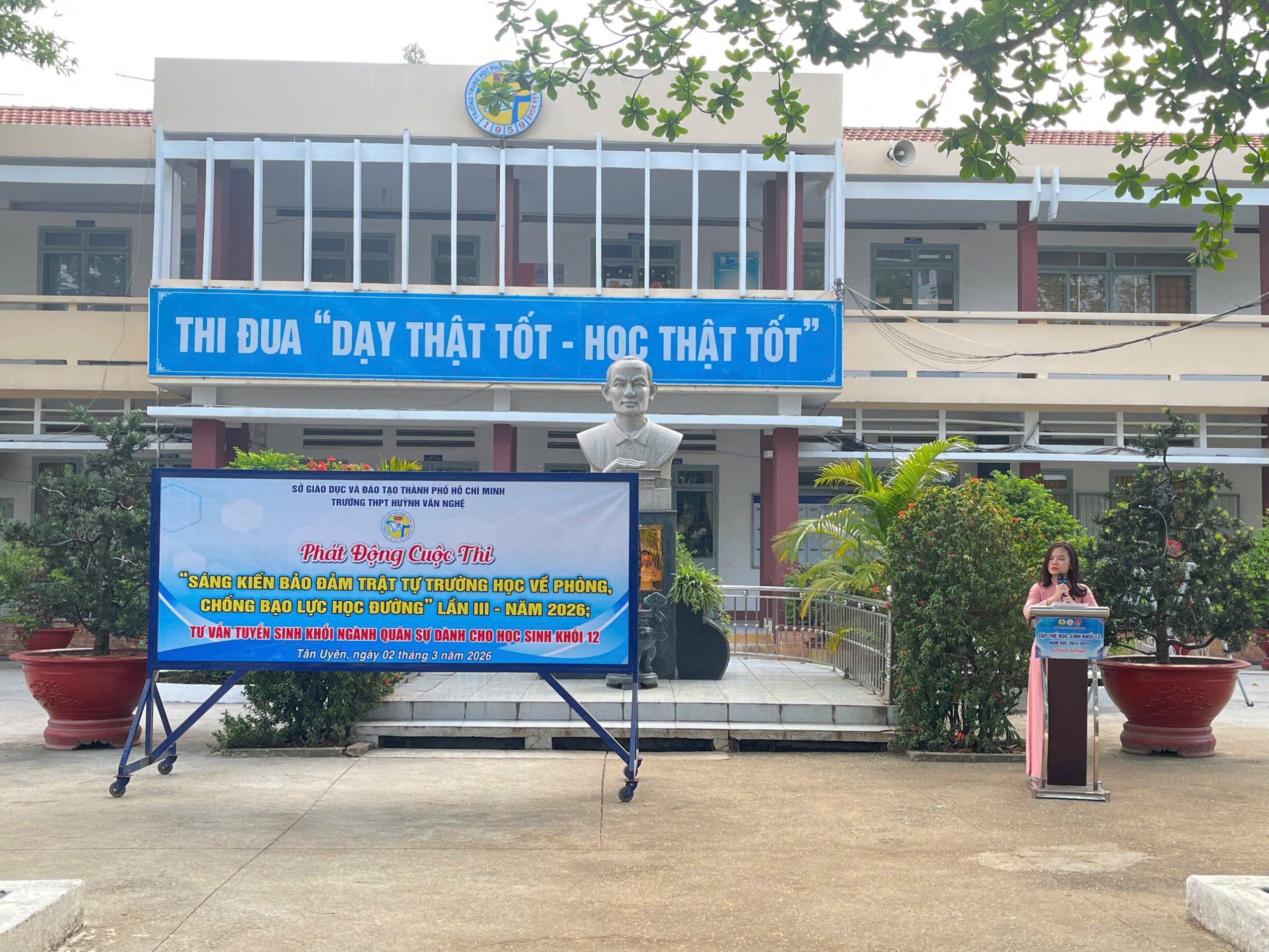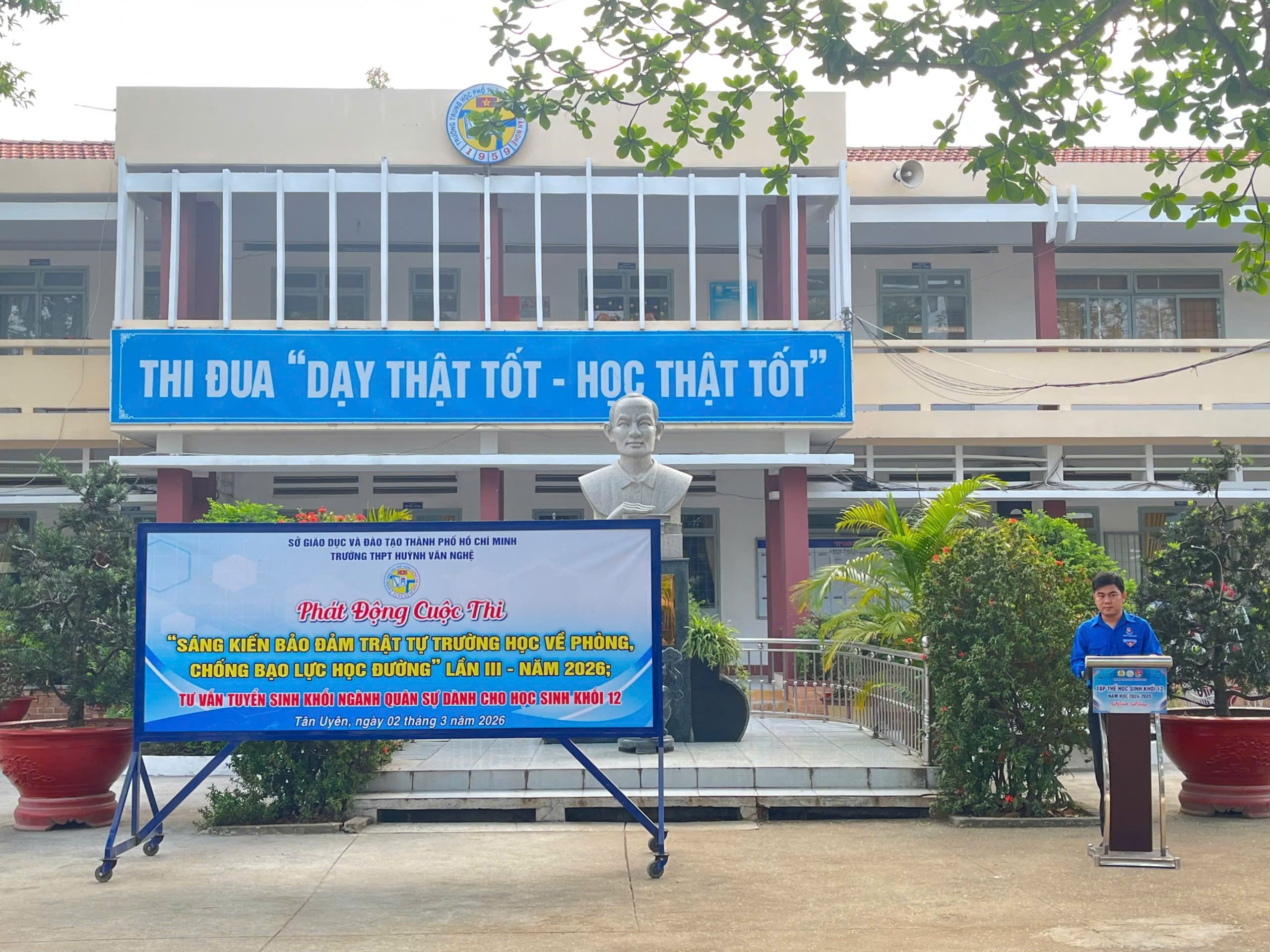 Sáng ngày 02/3/2026, trong không khí trang nghiêm và đầy hứng khởi của buổi sinh hoạt dưới cờ đầu tuần, Trường THPT Huỳnh Văn Nghệ đã tổ chức lồng ghép nhiều nội dung ý nghĩa: Phát động cuộc thi “Sáng kiến bảo đảm trật tự trường học về phòng, chống bạo lực học đường” lần III – năm 2026; kể chuyện theo tấm gương đạo đức Hồ Chí Minh; giới thiệu sách tháng 3 và tư vấn tuyển sinh dành cho học sinh khối 12.