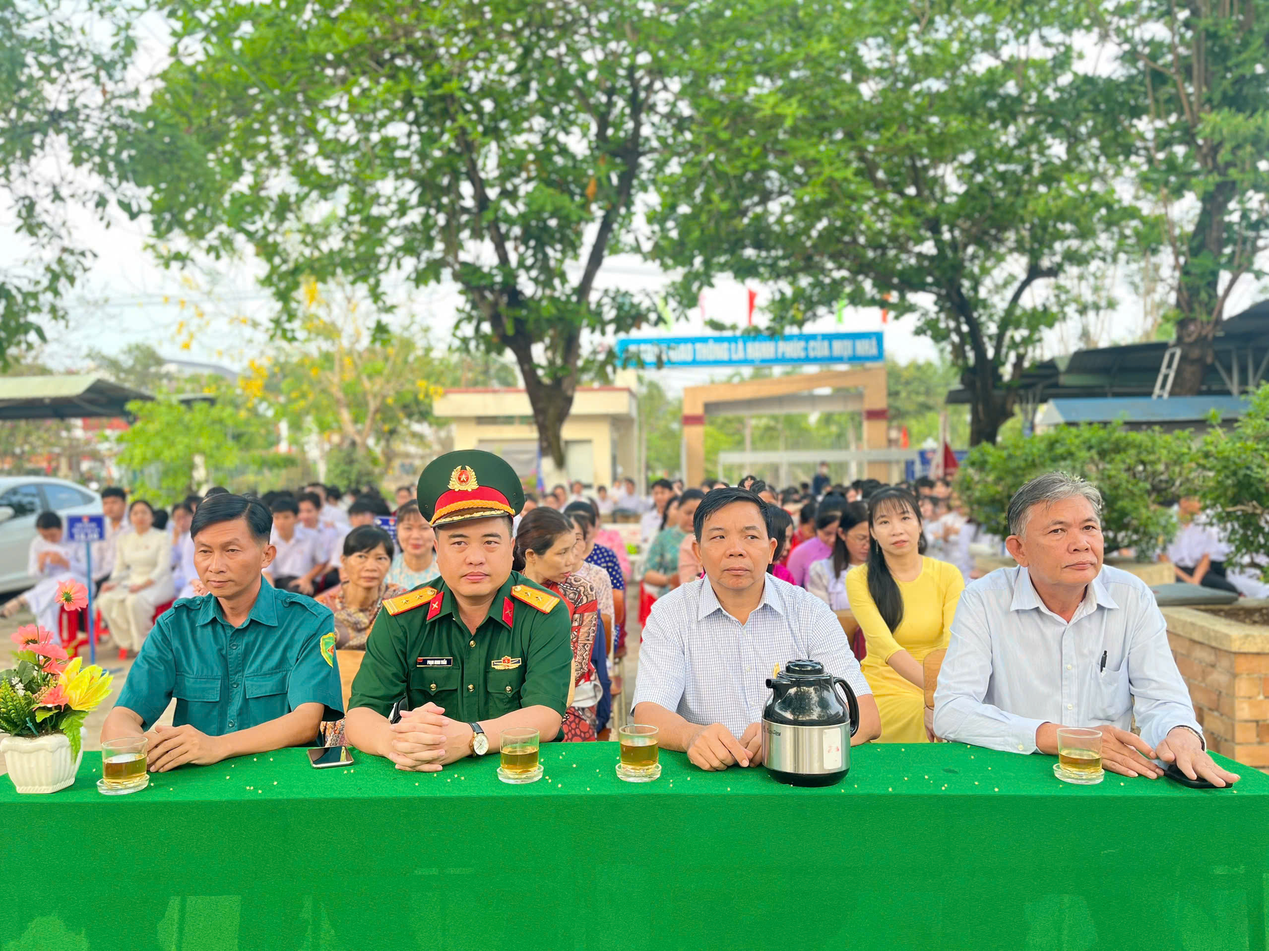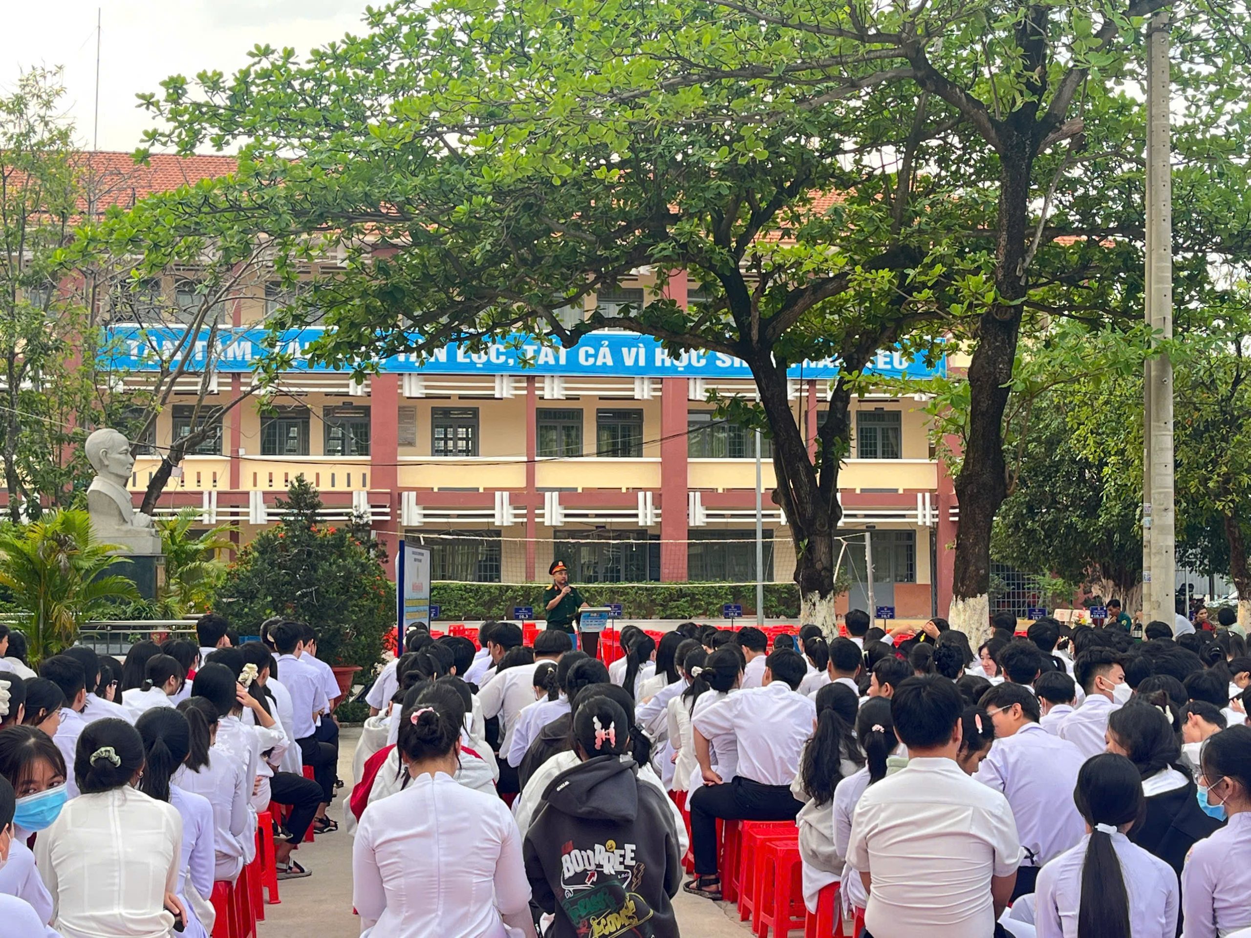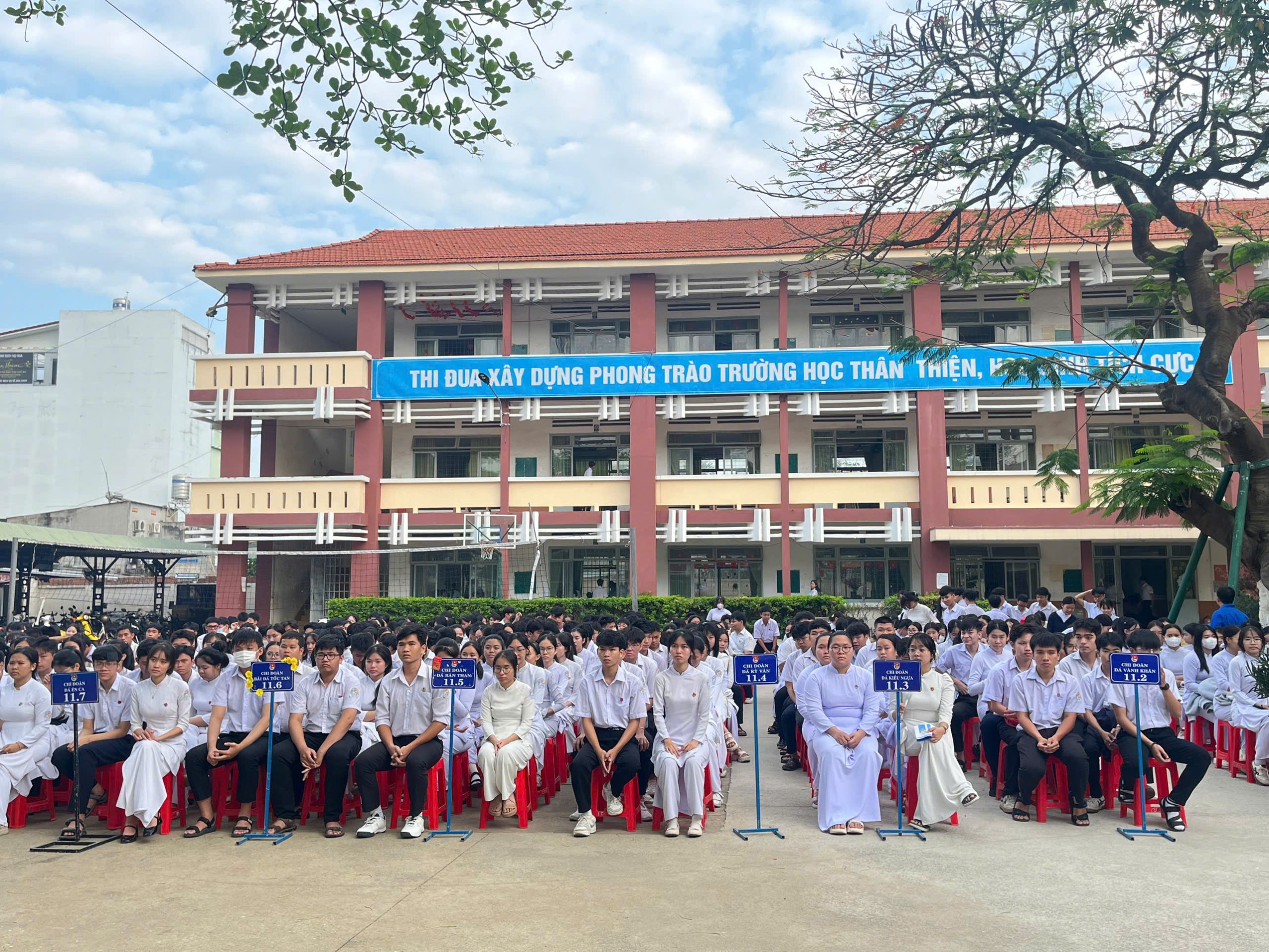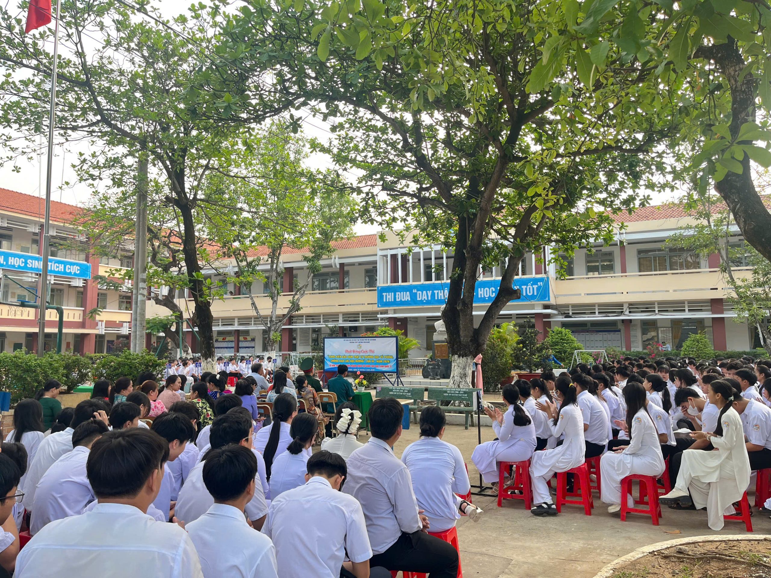 Ngay sau nghi thức chào cờ trang trọng, đại diện Ban Giám hiệu nhà trường đã phát biểu khai mạc và chính thức phát động cuộc thi “Sáng kiến bảo đảm trật tự trường học về phòng, chống bạo lực học đường”. Cuộc thi hướng đến mục tiêu nâng cao nhận thức, trách nhiệm của học sinh trong việc xây dựng môi trường học đường an toàn, lành mạnh, thân thiện; khuyến khích các em đề xuất những ý tưởng, giải pháp thiết thực, khả thi nhằm ngăn ngừa và đẩy lùi tình trạng bạo lực học đường. Đây là hoạt động có ý nghĩa thiết thực, góp phần cụ thể hóa phong trào thi đua “Dạy thật tốt – Học thật tốt” của nhà trường.