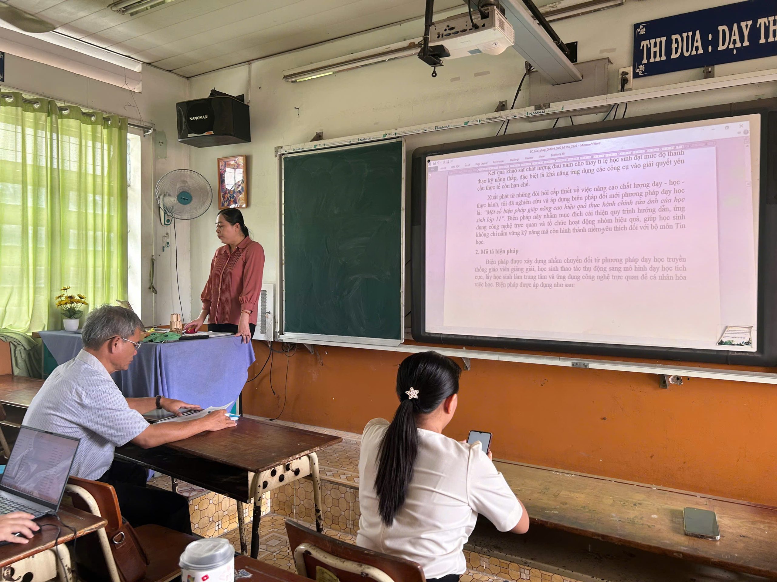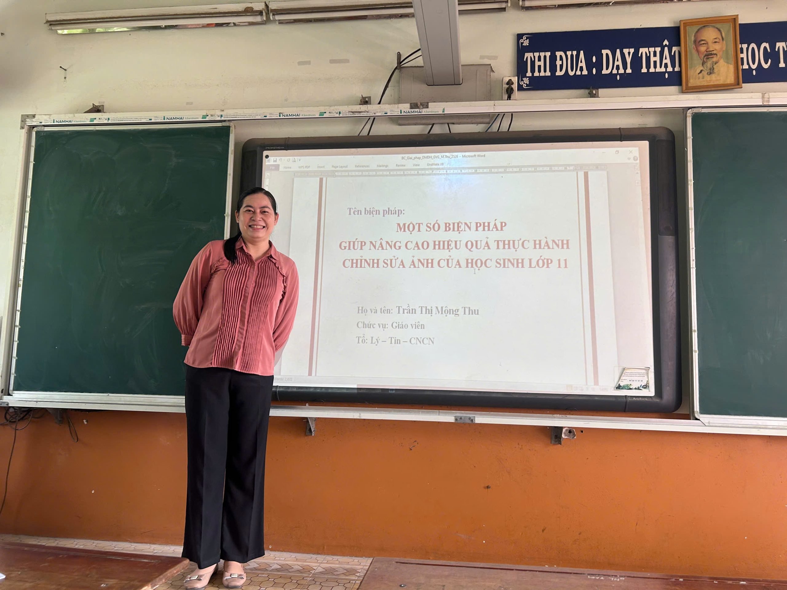 • Cô Trần Thị Mộng Thu trình bày đề tài “Một số biện pháp giúp nâng cao hiệu quả thực hành chỉnh sửa ảnh của học sinh lớp 11”. Các biện pháp đề xuất phù hợp với đối tượng học sinh, chú trọng rèn luyện kỹ năng thực hành và ứng dụng công nghệ thông tin.